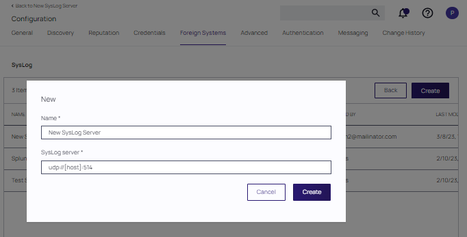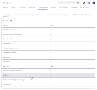 - On the Configuration page, select the Foreign Systems tab. Then, click Syslog.