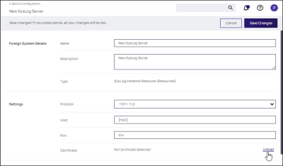 - On the New Syslog Server page, select TCP + TLS for protocol.