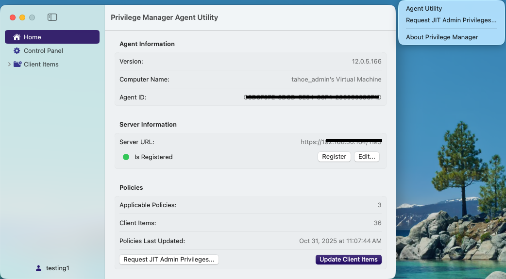 - Show Menu Bar Icon: This setting enables a IBM Security icon in the menu bar. Clicking the icon presents a menu that allows the user to open the Agent Utility. (If the icon is not visible in the menu bar, the Agent Utility can be opened by double-clicking the Privilege Manager application icon in the Applications folder.) Refer to macOS Agent Utility.