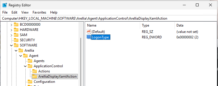 HKEY_LOCAL_MACHINE\SOFTWARE\Arellia\Agent\ApplicationControl\ArelliaDisplayXamlAction