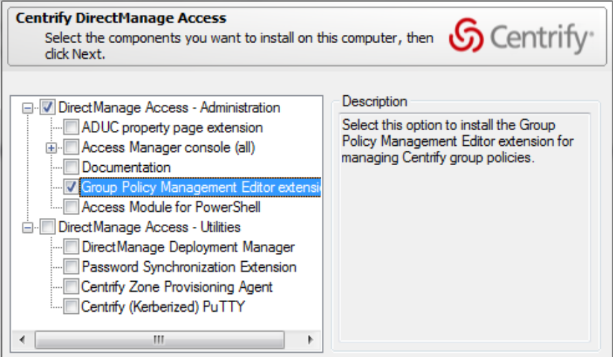 The group policy extension package has its own .exe and .msi installer files, so that you can install group policy extensions interactively through an installation wizard (by executing the .exe file) or silently from the command line (by executing the .msi file). Additionally, you can select or de-select the group policy extensions for installation when you run the Access Manager installation wizard.