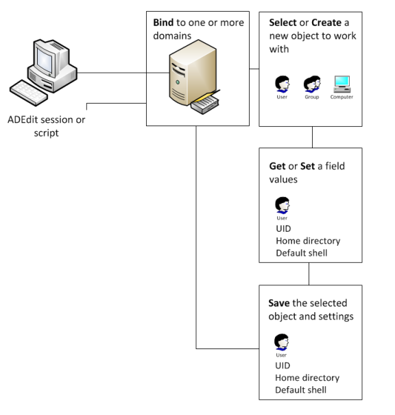 Outside of scripts that perform the most common administrative tasks, you might use ADEdit commands differently and without following these steps. For example, you might use ADEdit to convert data from one format to another, view help, or get information about the local computer without following the typical logic flow, but those tasks would be exceptions to the general rule.