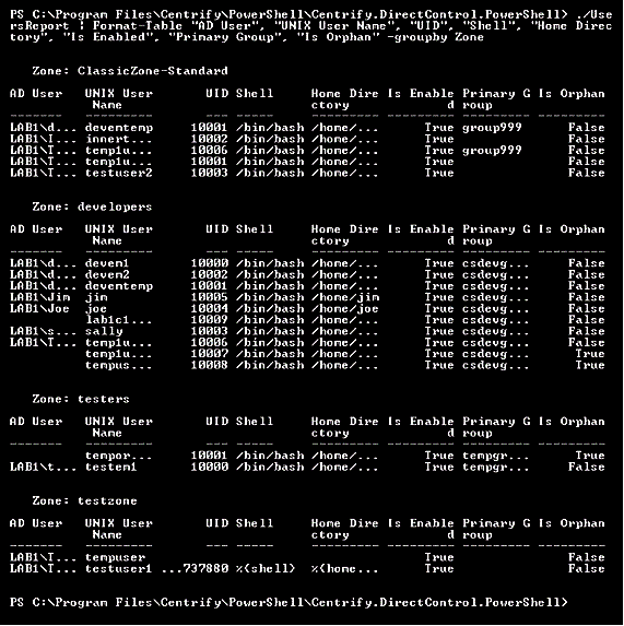 . PS> ./UsersReport.ps1 | Format-Table "AD User", "UNIX User Name", "UID", "Shell", "Home Directory", "Is Enabled", "Primary Group", "Is Orphan" -GroupBy Zone