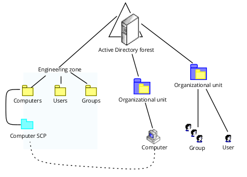 The structure of the zone and its sub-containers is the same as the classic IBM Security zone layout, with each zone stored as a separate tree in the directory and sub-containers for the Users, Groups, and Computers in each zone, but only the Computers sub-container is used.