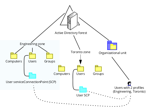 The following figure illustrates how the zone tree structure enables a single Active Directory user to have many different UNIX profiles.