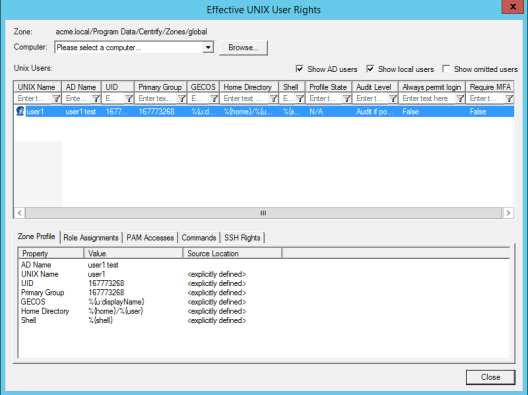 Often, you need to see which users have what privileges in a zone. Access Manager provides you a single view of all of the effective users in a zone and lets you tab through their account properties.