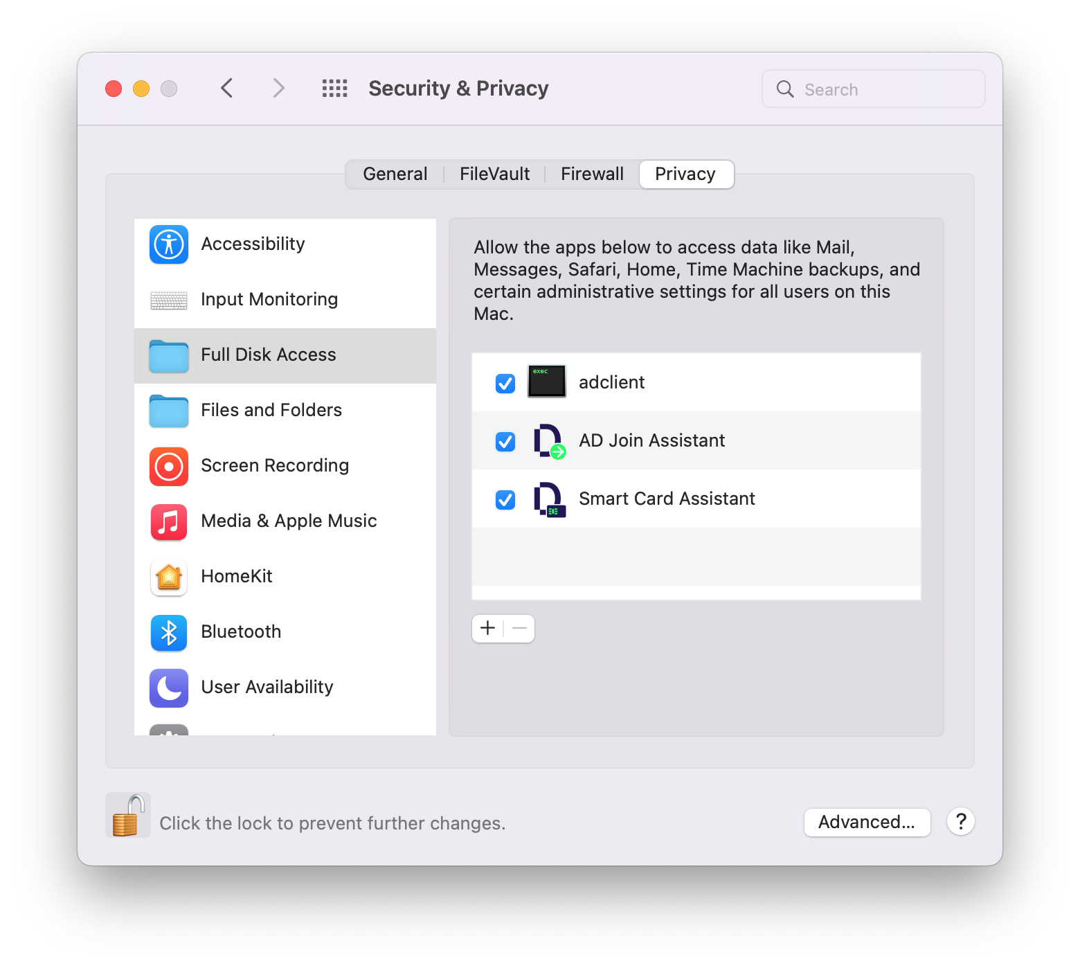 Due to a limitation of macOS 11.x and macOS 12.x, “Full Disk Access” is required for the DirectControl Agent for Mac. You can configure this yourself if you're an administrator on the computer, or you can set it by way of your MDM (Mobile Device Management) provider.