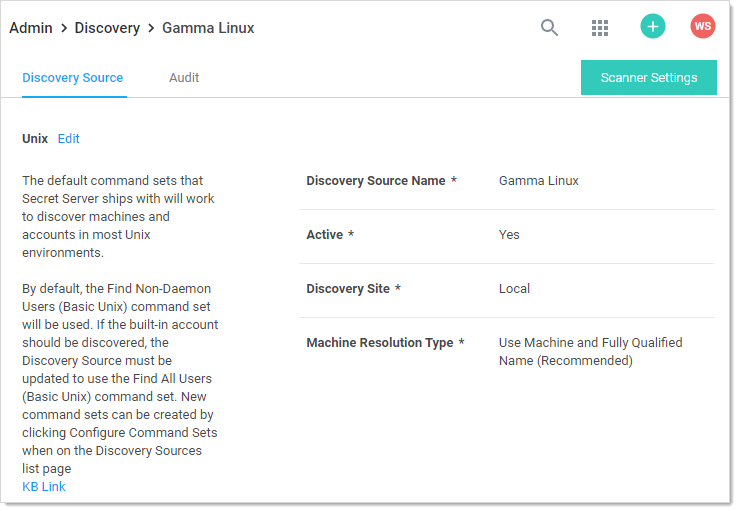 The Command Set contains customizable Unix command sets sent over an SSH connection that are used to gather information from them machine when it is scanned. The command set is defined on the discovery scanner. To change a command set, you must create a new machine scanner.