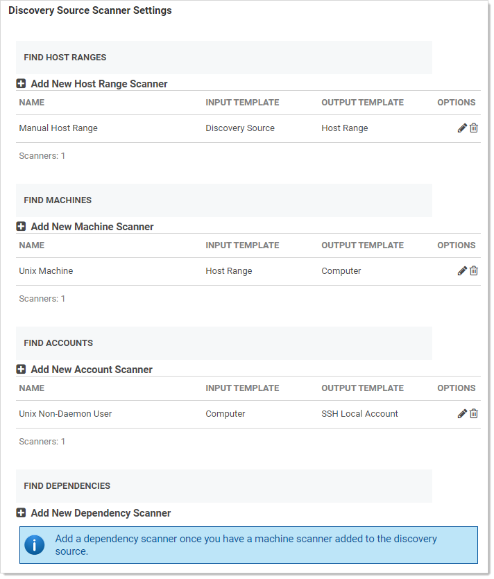 Notice that there is no dependency scanner defined, and it was not an option in the discovery source wizard used to create this scanner set, so if you want to discover dependencies, you must manually edit the scanner set.Scanner Input Template Output Template Manual Host Range (Find Host Ranges) Discovery Source Host Range Unix Machine (Find Machines) Host Range Computer Unix User (Find Accounts) Computer SSH Local Account Unix Non-Daemon User (Find Accounts) Computer SSH Local Account SSH Public Key Scanner (Find Accounts) Computer SSH Public Key None (Find Dependencies) None None If no dependency scanners are available with an input template matching an output scan template from the previous step that has not already been used by another scanner in this step, you cannot add a dependency scanner. The output template must be unique for each scanner but the input template may be shared. -