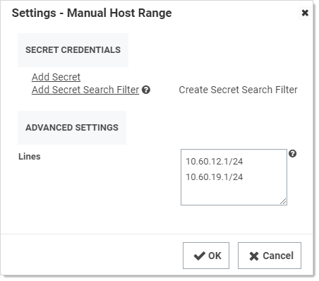 - The Lines text box may input multiple IP address ranges but not overlapping IP address ranges on the same discovery source. There should be one IP address range per line in the input text box.