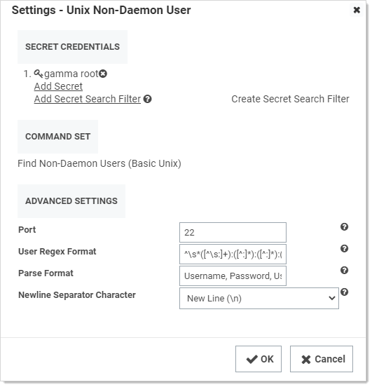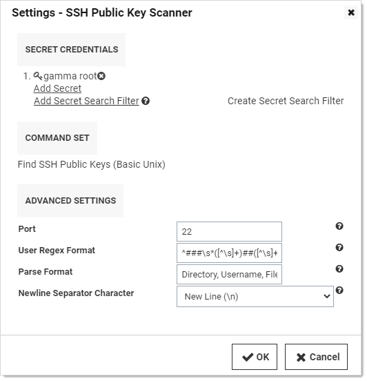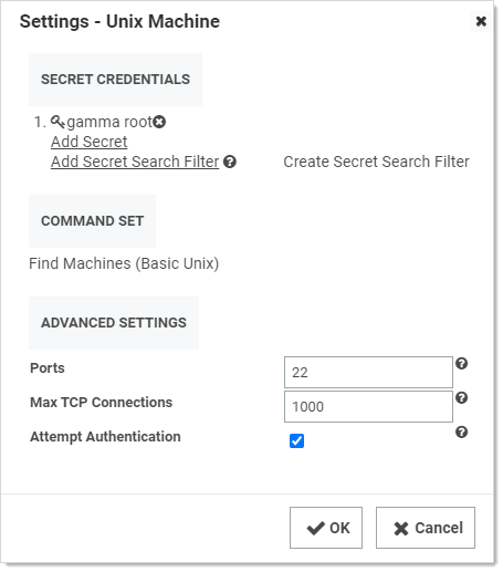 - The Secret Credentials secret is the same one used for the Unix Machine scanner, but it is possible to use a different one.