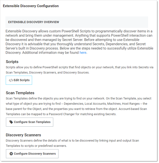 Extensible discovery lets you extend the already powerful scanning abilities of Verify Privilege Vault by creating custom scanners that run PowerShell. You can use either built-in or custom scanners and templates at each step of the discovery process in extensible discovery.