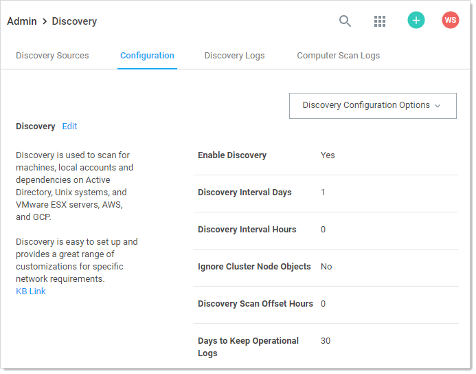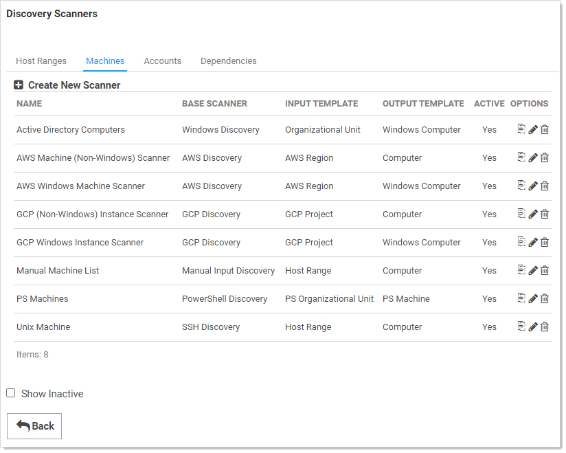 Discovery scanners can run custom PowerShell scripts, as well as our built-in scanners for Active Directory, UNIX, and VMWare ESXi. You can use one or more built-in or custom scanners at each step of the discovery process: host range discovery, machine discovery, local account discovery, and dependency discovery.
