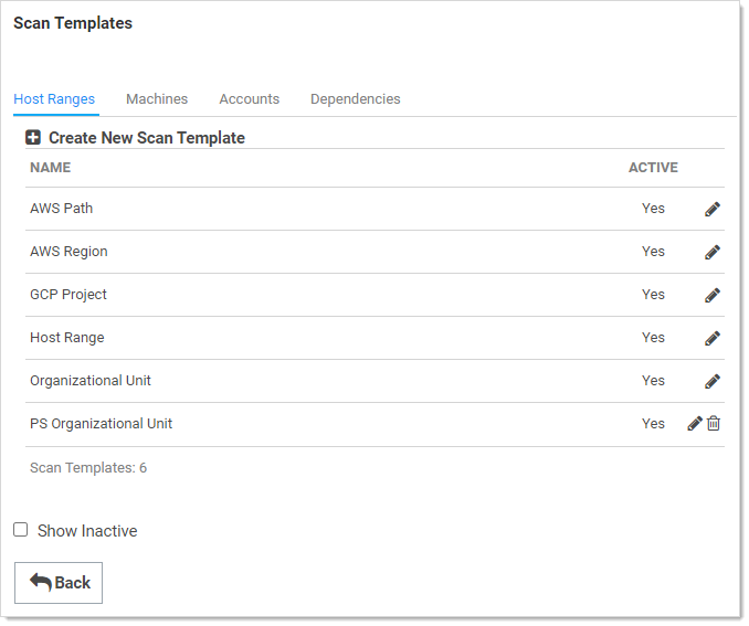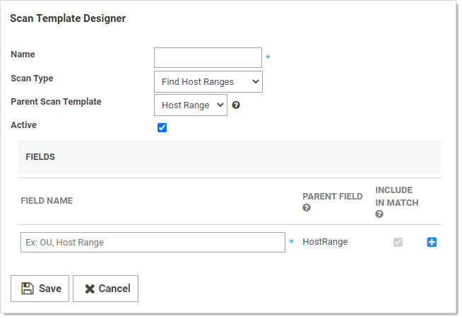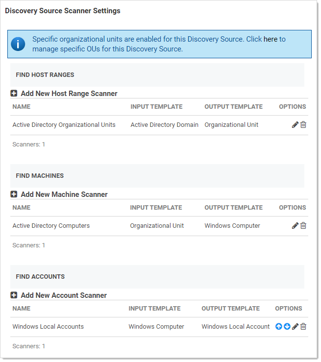 Leave the Discovery Type dropdown list set to Find Host Ranges. This is the scanner type we are creating. This where in the discovery process the scanner runs. Discovery scanning always proceeds Host Ranges > Machines > Local Accounts > Dependencies. The scan templates, discovery scanners, and discovery source pages all organize their contents in the same order.