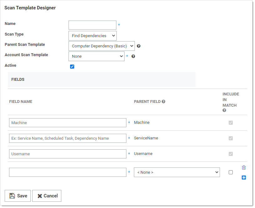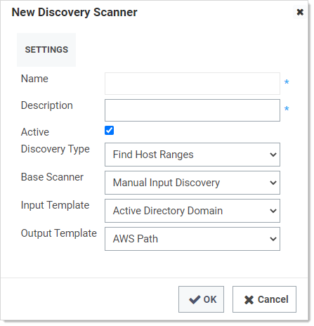 Click to select Active Directory Domain in the Input Template dropdown list. The input and output templates are where you define the information flow through the discovery process. Each scanner uses the output of a previous step as its input. Each scanner returns a list of results as its output. The input template defines what to use as the input data for this scanner. The output template defines what is returned from the scan and used elsewhere. To see what scanner (if any) consumes the output of a given scanner, look for the one that has the same input template as the original scanner's output.