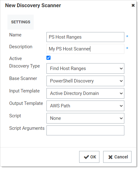 - When using a PowerShell base scanner, you also select what script to run and any arguments to pass to the script.