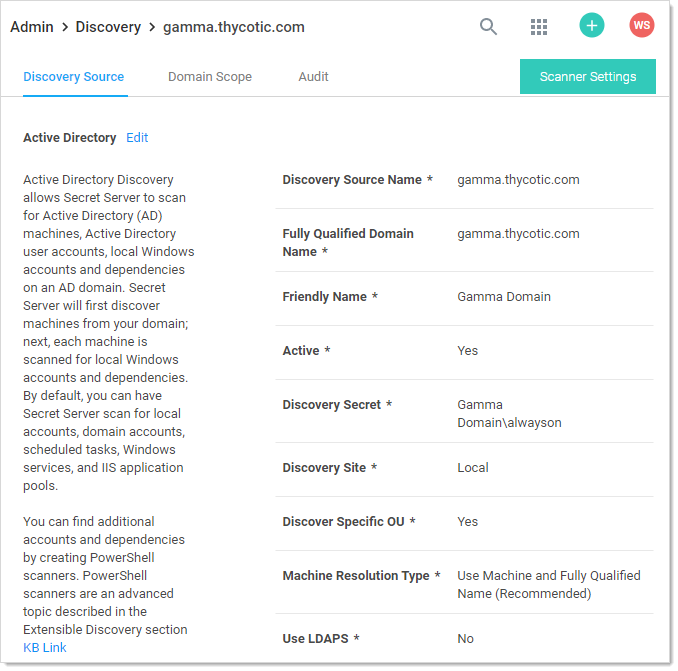 Select a secret that has permissions to scan the domain, such as the account you linked to the domain when adding the discovery source.