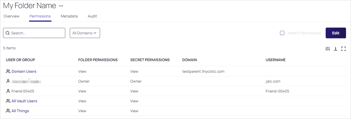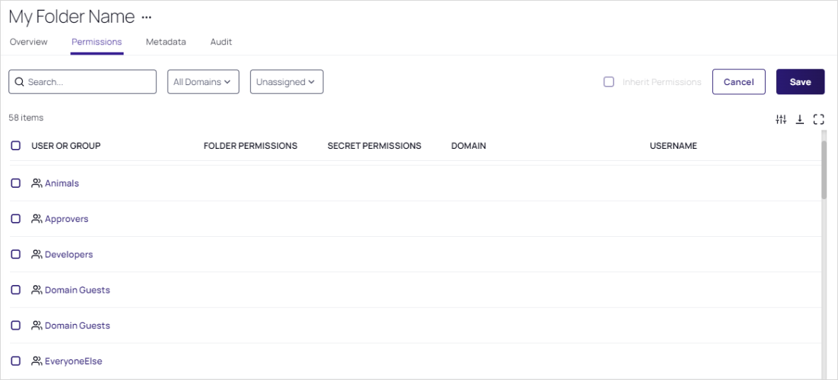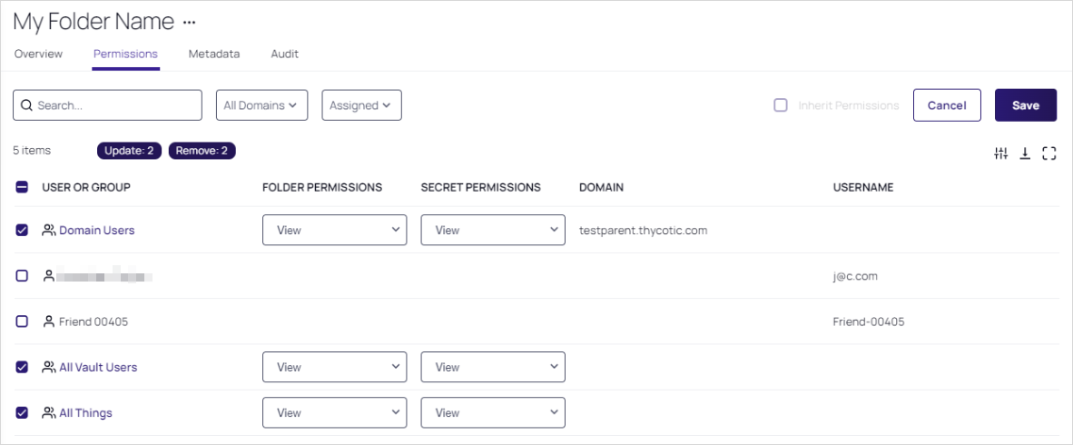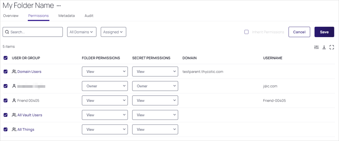 For each user or group, click the Folder Permission dropdown list for the desired user of group to select the desired maximum permission available to them for the folder: View (folder), Add Secret (to folder), Edit (folder), or Owner (of folder).