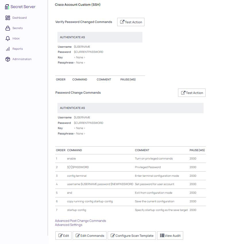 This document briefly discusses using Secret Server Remote Password Changing (RPC) for Cisco Account (SSH) and Cisco Account (Telnet) accounts. With Remote Password Changing (RPC), secrets can automatically change remote account passwords when a secret expires, either immediately or on a defined schedule. In addition, the new passwords’ strengths and other qualities are completely configurable. See the Password Changer List for a complete list of available password changers.
