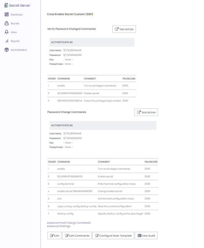 This document briefly discusses using Secret Server Remote Password Changing (RPC) for Cisco Enable Secret (SSH) and Cisco Enable Secret (Telnet) accounts. With Remote Password Changing (RPC), secrets can automatically change remote account passwords when a secret expires, either immediately or on a defined schedule. In addition, the new passwords’ strengths and other qualities are completely configurable. See the Password Changer List for a complete list of available password changers.