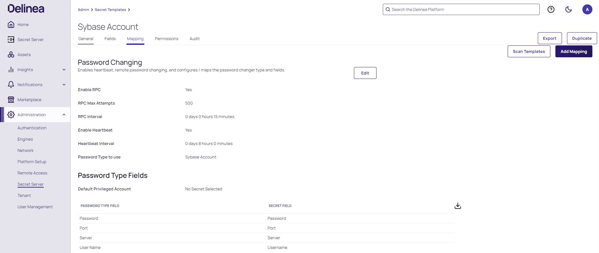 After completing the RPC setup, you can manage the built-in secret templates. Each secret template is specific application and is preconfigured with the password changer best suited to that. For the Sybase Account, we want the Sybase Account template.