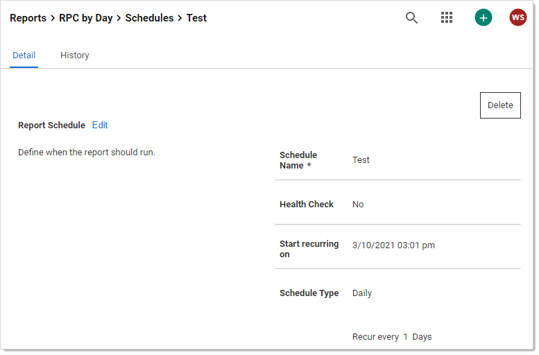 To view existing schedules for a report, click Schedule on the Report View screen. A list of existing schedules for the report appear in the grid.