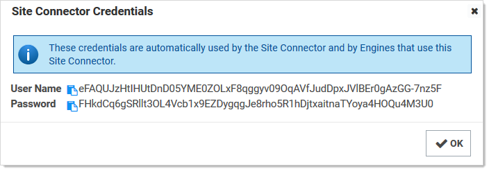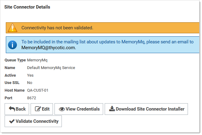 Click the View Credentials button to retrieve the automatically generated credentials. The Site Connector Credentials popup appears. You can ignore the informational message that the connectivity has not been validated for now as you will be doing so after you install RabbitMQ on the host you have selected.