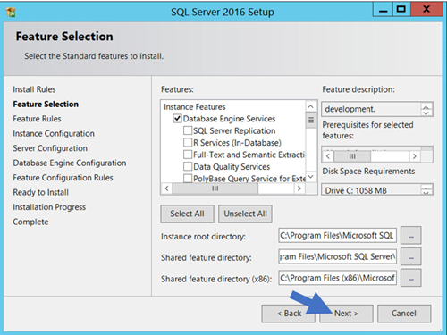 Ensure the Database Engine Services check box is selected. This is the only feature necessary for Verify Privilege Vault. Unless you are using Geo-Replication, you can leave everything else unchecked. Leave the directory locations unchanged.