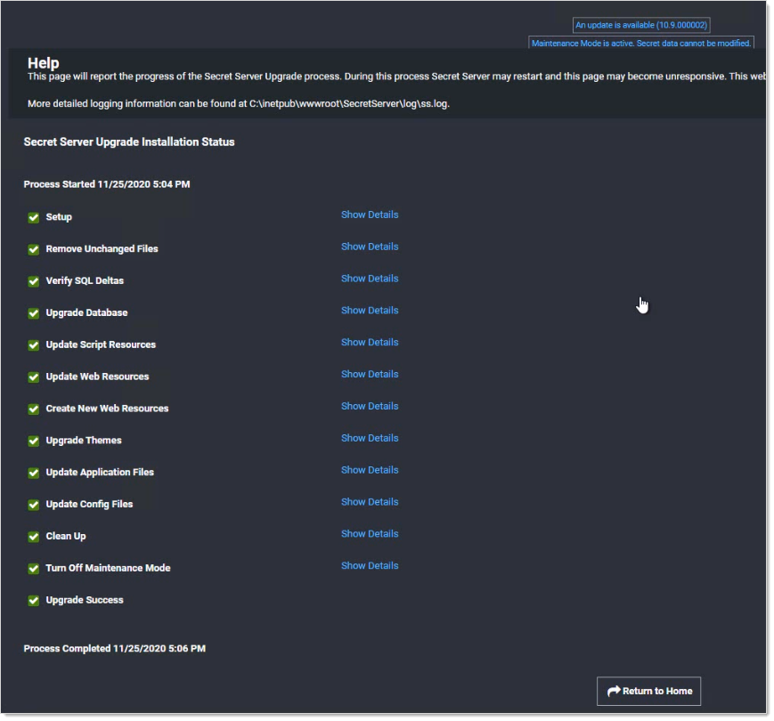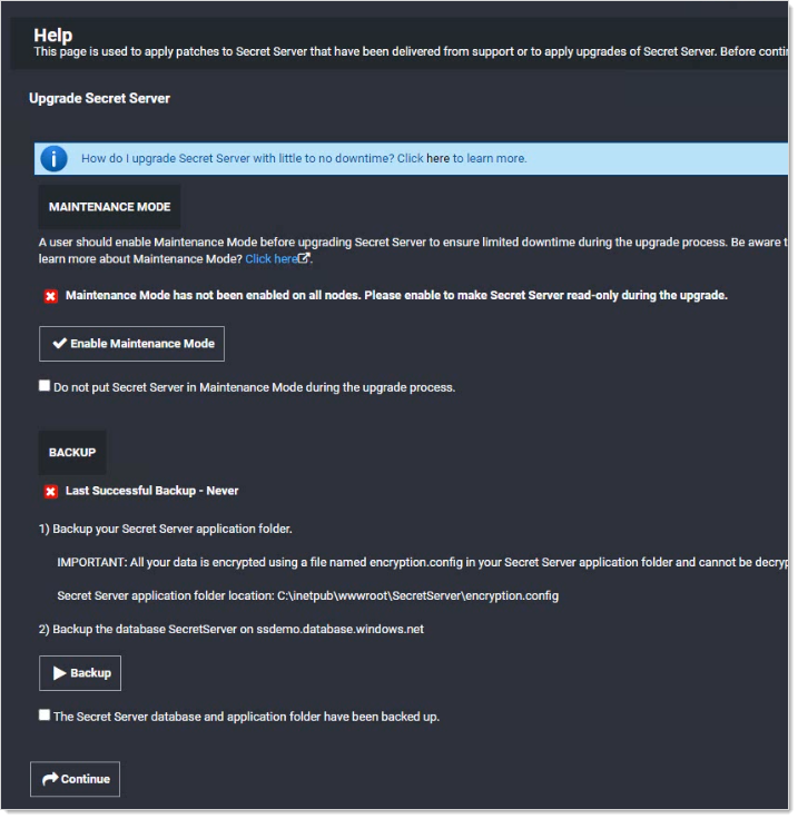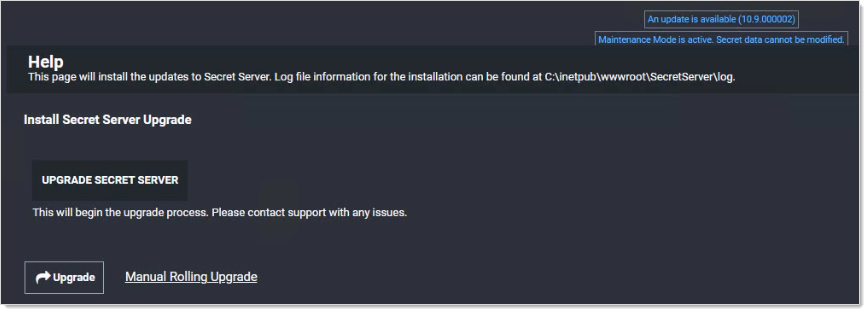 http://<yourinstance>/SecretServer/Setup/Upgrade. The Verify Privilege Vault Setup Home page appears:If your computer does not have outbound network access, please see Upgrading Verify Privilege Vault Without Outbound Access. -