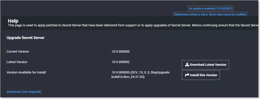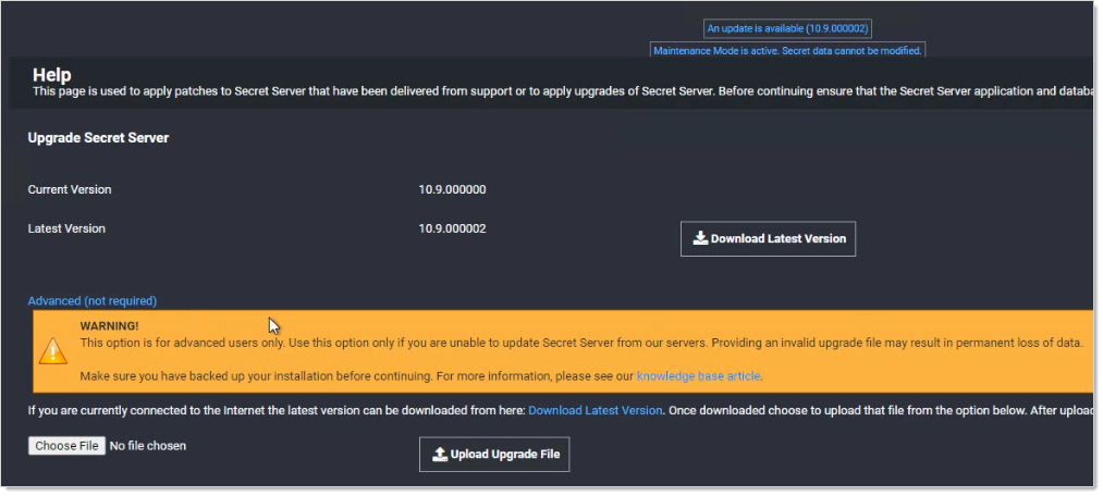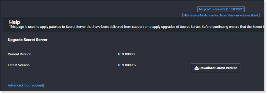 Verify Privilege Vault periodically polls the update server to detect new updates. If the "Allow Automatic Checks for Software Updates" option is enabled in the Admin > Configuration menu, you will see the "An update is available (xx.x.xxxxxx)" link after logging in with an administrator account. The steps below can be used to perform an upgrade for versions 7.1.000015 and higher. If you have an older version of Verify Privilege Vault, please contact IBM Security technical support for assistance.