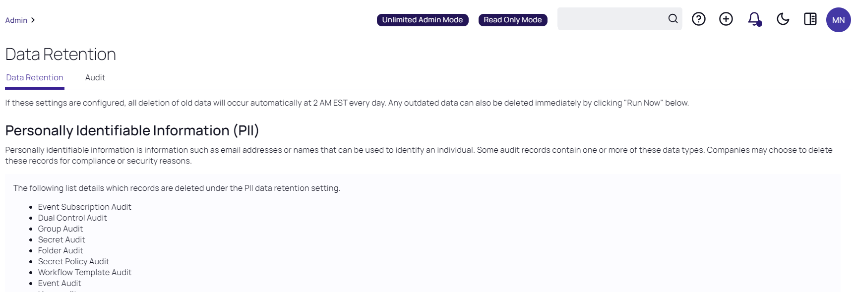 Access to the audit-data detention management pages in Verify Privilege Vault is limited to users with the roles "View Data Retention" and "Administer Data Retention." As the names imply, only the latter role can manage audit data retention, such as editing and running now.