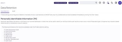 Personally identifiable information is information such as email addresses or names that can be used to identify an individual. Some audit records contain one or more of these data types. Companies may choose to delete these records for compliance or security reasons.