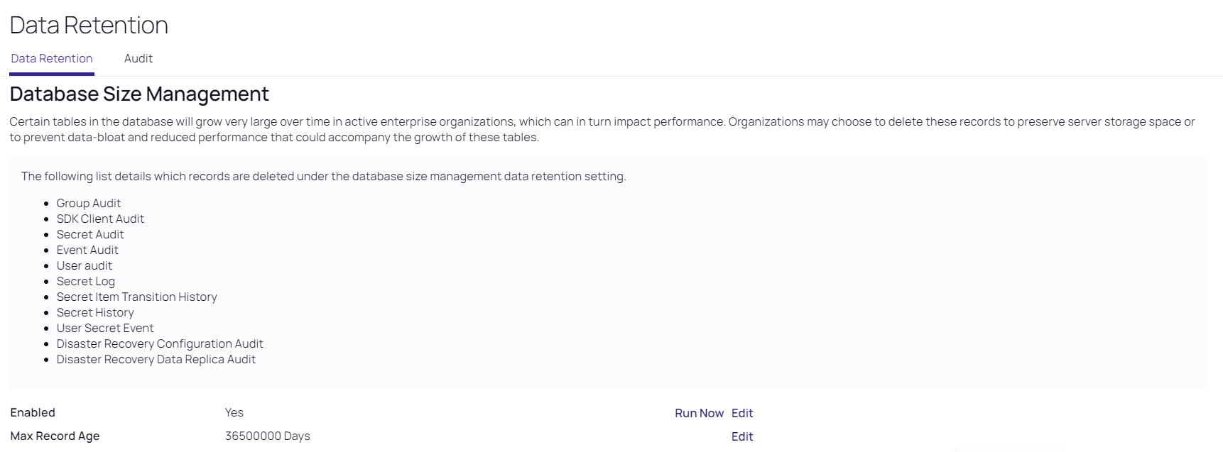 Verify Privilege Vault can automatically delete older audit and audit-like information (both are called "audit data" here). By default, Verify Privilege Vault does not delete any audit data.