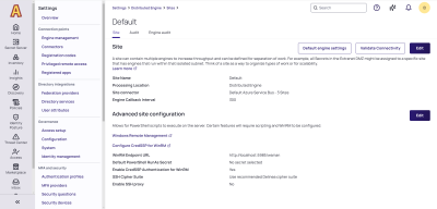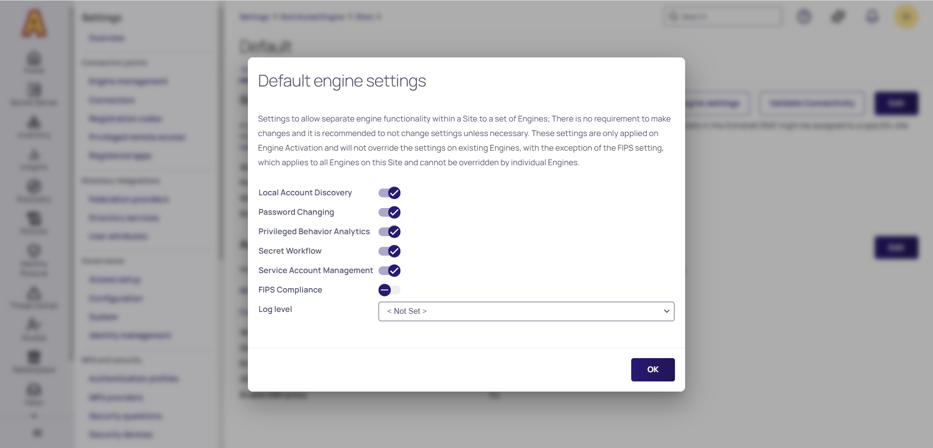 FIPS Compliance is the only setting only available at the site level, and all DEs on the site use the same value. You cannot have a mix FIPS and non-FIPS engines on a single site. If you toggle the FIPS Compliance setting, Windows OS FIPS setting needs to be set to match it, and the engine server should be rebooted. The next time an engine checks in, if the engine’s settings have been changed from those set on the site, the engine reloads itself and starts only performing the site's selected duties.