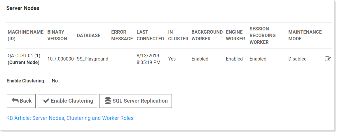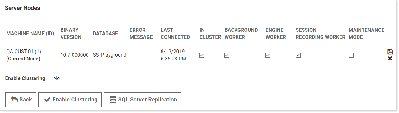 - In Cluster is a toggle that turns a server node on or off. If enabled this node can process Web requests, and (if configured) will run the background, engine, and session recording roles. If disabled, the node is just a backup—it cannot run any roles, and trying to access the website on the node will redirect to the server nodes page.