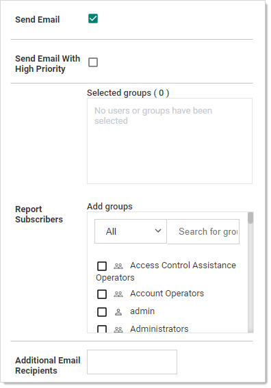 - Send Email:Verify Privilege Vault sends an email containing the generated report every time the schedule runs. Enabling this setting also allows you to specify whether the email is sent with the high priority flag and a list of Verify Privilege Vault users or groups that receive the generated report email. Add additional email recipients in the text box below the subscribers, separating recipients with a semi-colon.