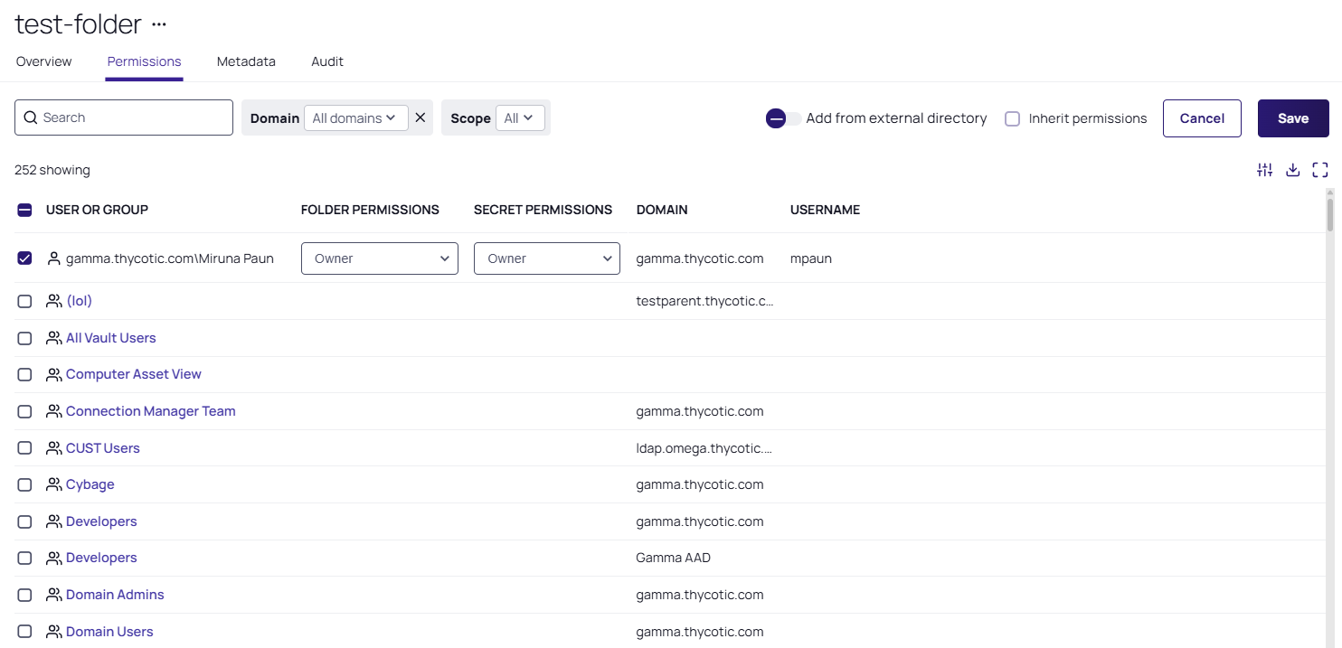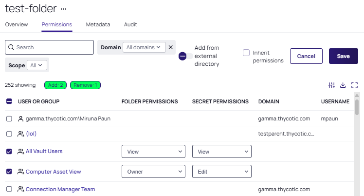 To add a user or group, select the checkbox next to each user/group and choose from the Folder and Secret permissions dropdown lists that appear.