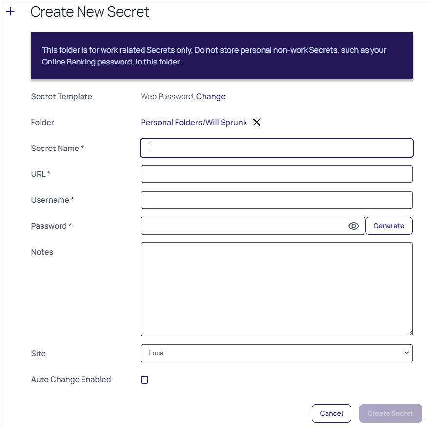 These pages differ significantly, based on the secret template you chose. For this instruction, we chose the frequently used Web Password template. -