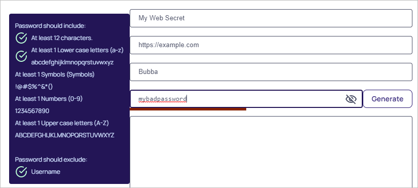 Click the Generate button to create a strong password that meets the requirements for that type of secret. You can also add your own.