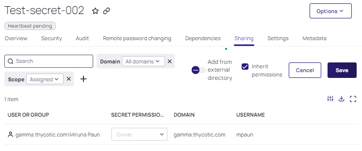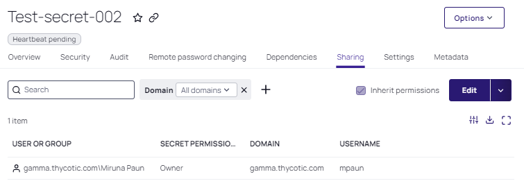 You can also modify sharing settings for users or groups that already have sharing enabled for the secret. If a user or group is not displayed, they do not have access to the secret.