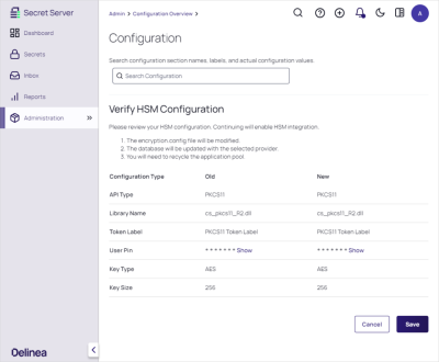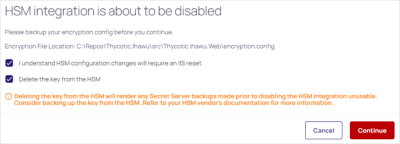 Additionally, an you can add an application setting to Verify Privilege Vault to prevent changes to HSM configuration. Enabling, rotating, and disabling this requires direct access to the file system where Verify Privilege Vault is installed.