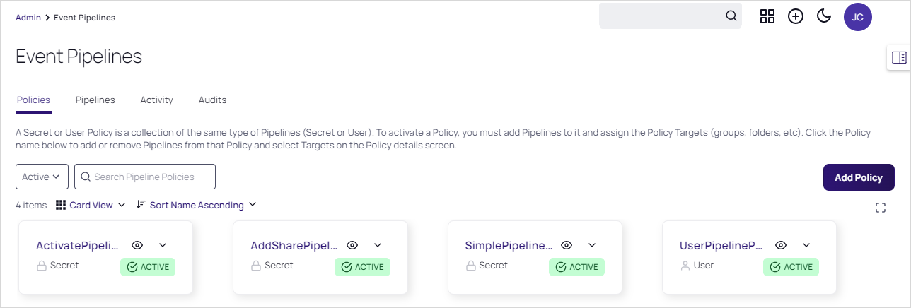 If necessary, click the Policies tab. The Event Pipeline Policies page appears.