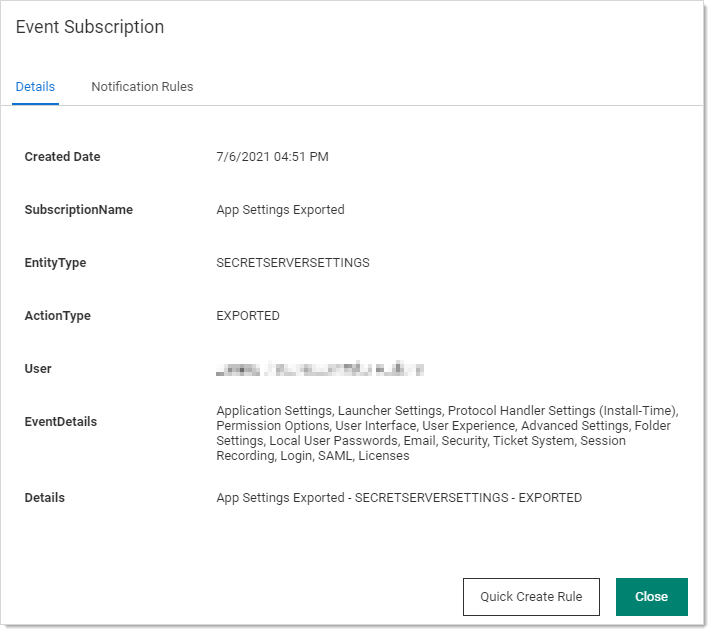 Details: Specific text string in the details section. The Details type serves as a summary of the message for display in the inbox. Sometimes it contains information that is from other condition types. For example: "App Settings Exported - SECRETSERVERSETTINGS - EXPORTED."