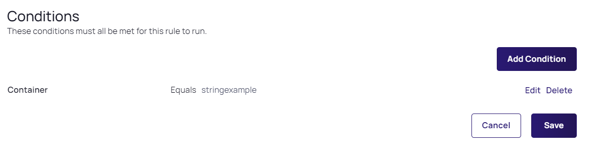 Rule conditions are filters that define who receives the email or Slack message when a notification arrives. Conditions are matched with text string matching: equals, not equals, or regex. If no condition exists, the rule triggers for every message of the defined types. Condition types include: