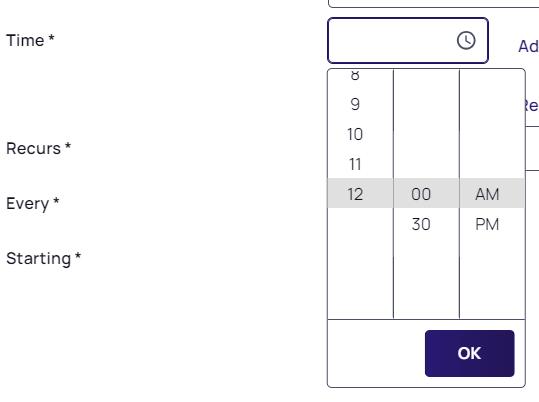 You also can simply type the time prior to clicking the clock icon in the format hh:mm AM/PM. If you choose minutes other than 00 or 30, it will be converted to the nearest 00 or 30 when you input it. -