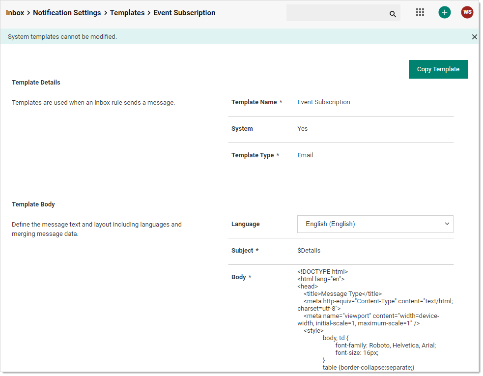 - A body section that defines the subject, language used, and the canned text for the message. The message contains variables that are drawn from the alert or event. The body is read only in system templates and is editable in custom templates cloned (copied) from system templates.