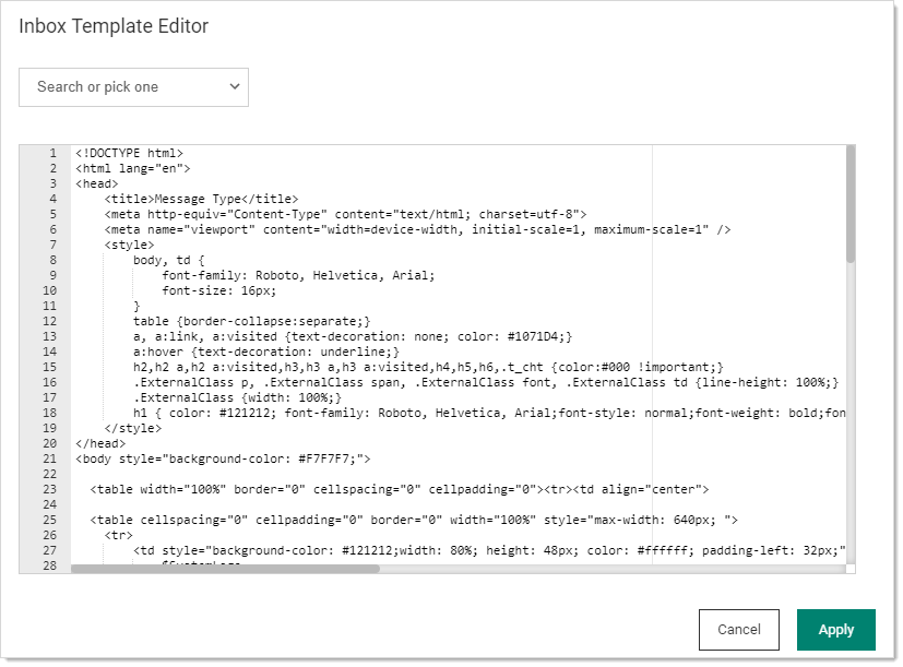 You can directly edit the HTML, but if you intend to add variables for Verify Privilege Vault to fill in, click the Template Editor link. The Inbox Template Editor popup appears: