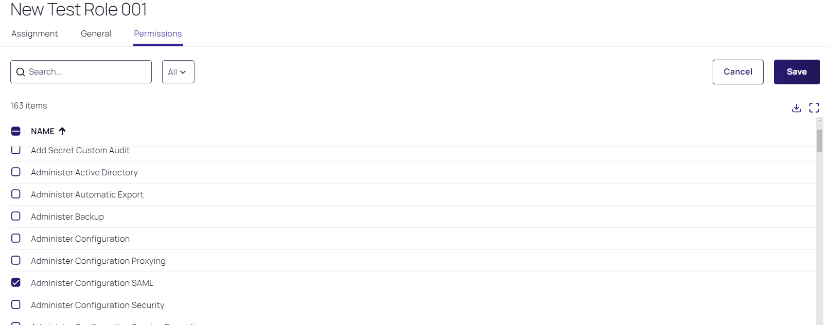 The "Administer Configuration SAML" role permission is required to configure SAML settings (no specific permission is required to access Verify Privilege Vault via SAML). To grant a user this permission from an administrator account:
