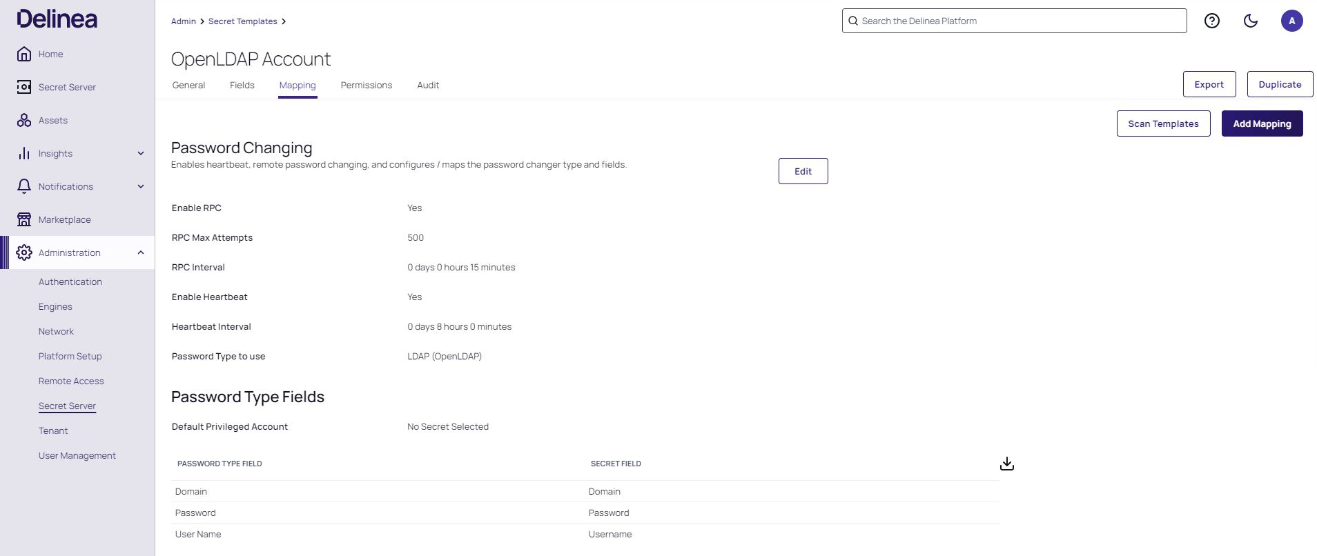 Select an OpenLDAP Account secret template and then click the Mapping tab.