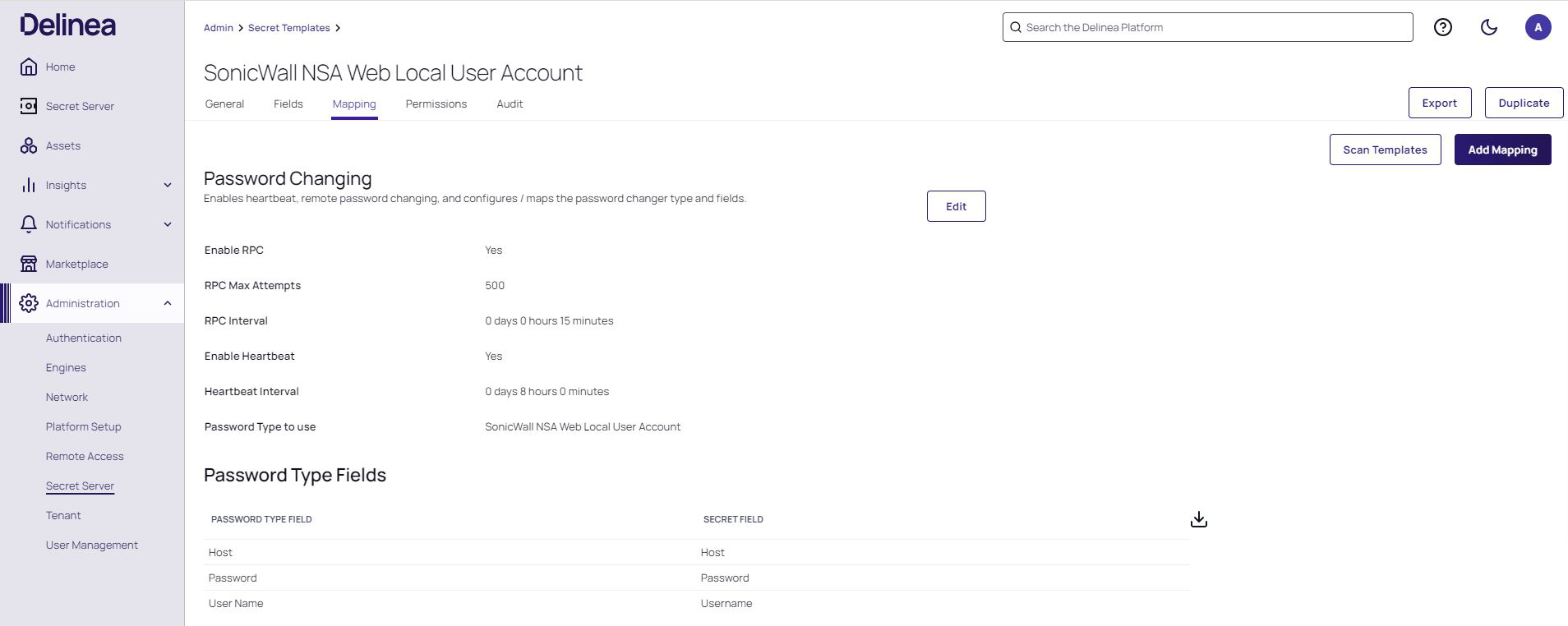 Select a SonicWall NSA Web Local User Account secret template and then click the Mapping tab.
